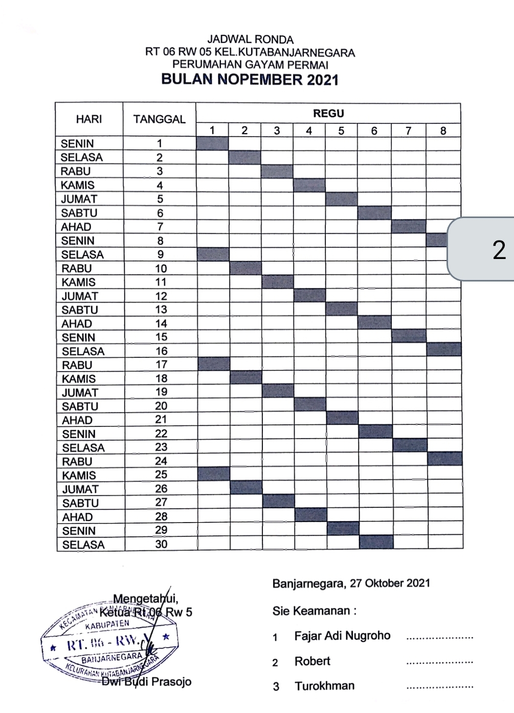 (*) Hasil jimpitan ronda dikordinir oleh seksi keamanan RT setiap bulan pada rapat RT dan disetorkan kepada Bendahara RT
